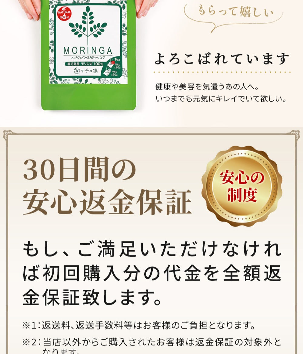 おうちモリンガ以外の商品:30日間の全額返金保証が付いております。適用は、次の条件を満たす必要があります。