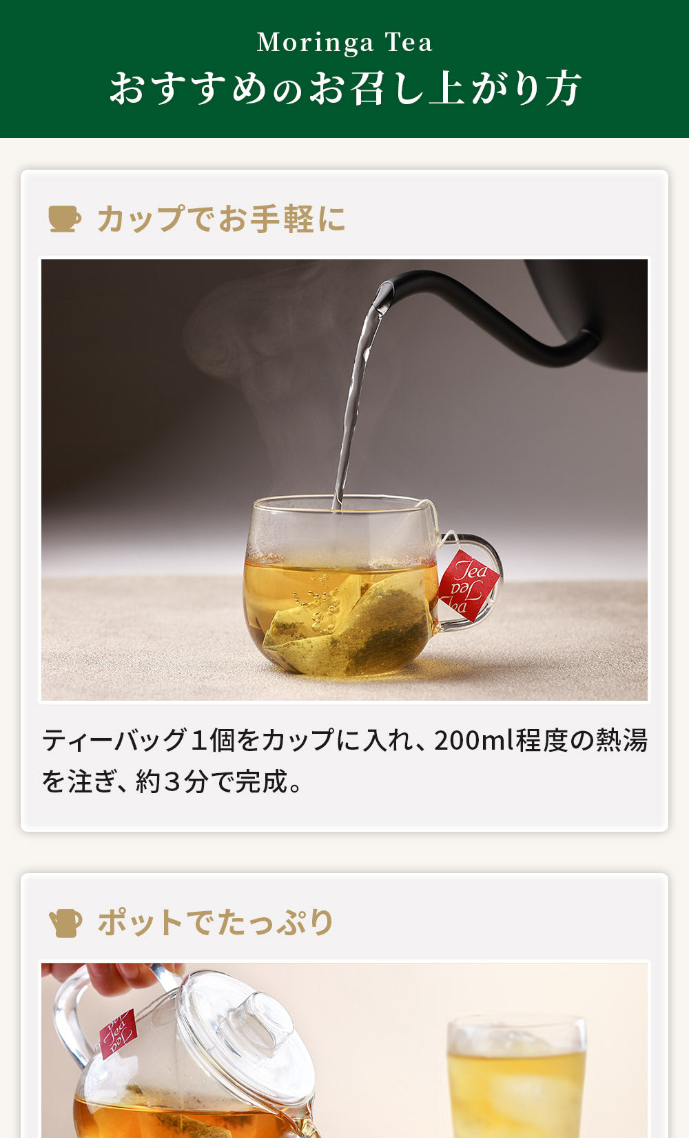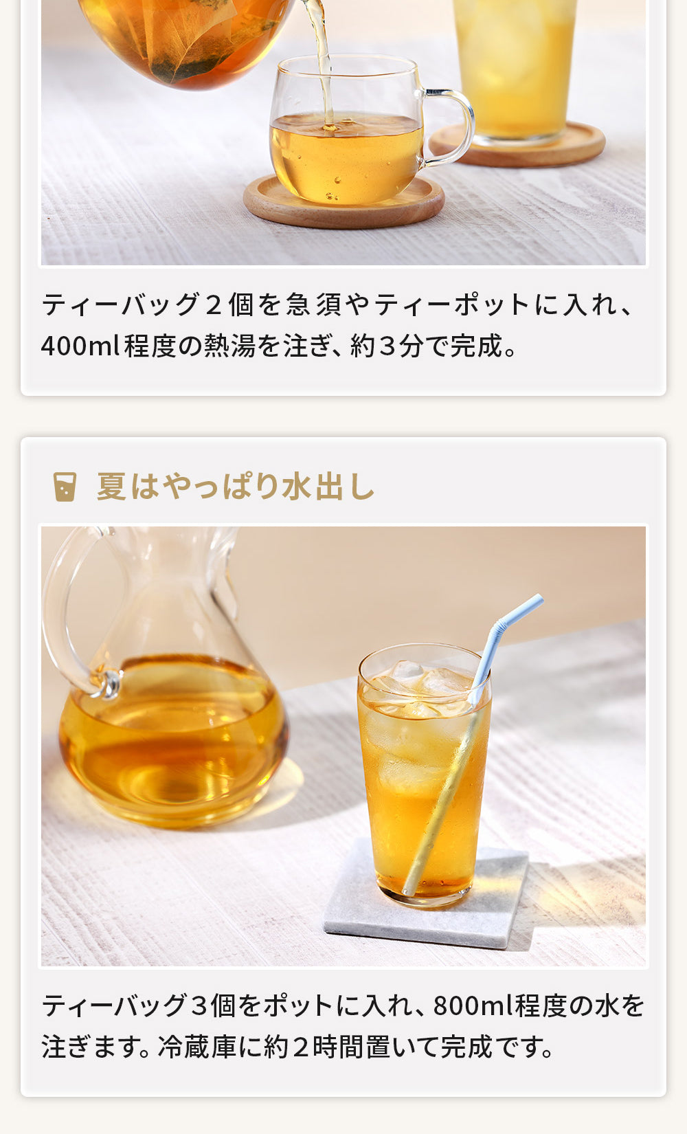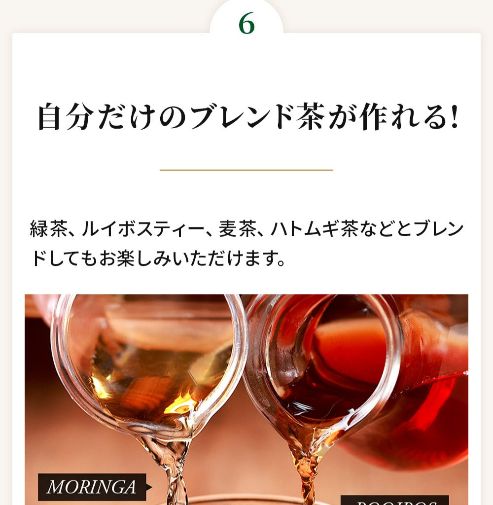 お召し上がり方 ティーバッグ1包に対し、200ml程度のお湯または水を注ぎ、お好みの濃さになりましたらお召し上がりください。ホットでもアイスでもおいしく召し上がれます。